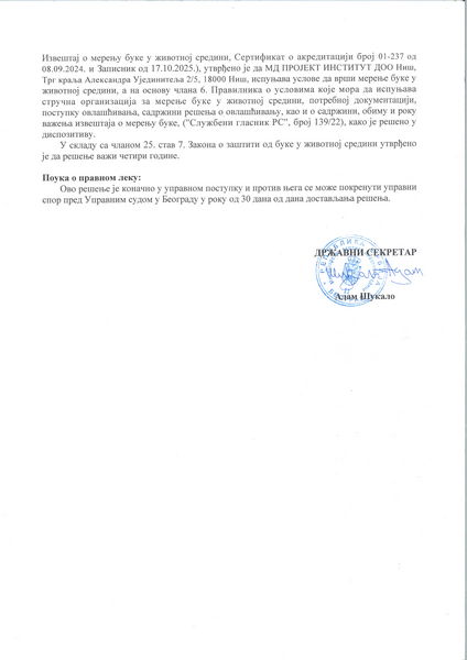 - Rešenje o merenju buke u životnoj sredini broj 003507978 2024 14850 003 005 501 069, od 27.10.2025.